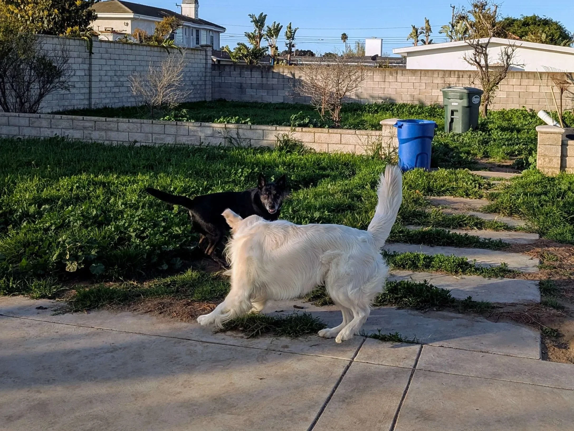 Two dogs playing in a grassy backyard with a stone pathway. A black dog and a white dog are visible, with trees and houses in the background.